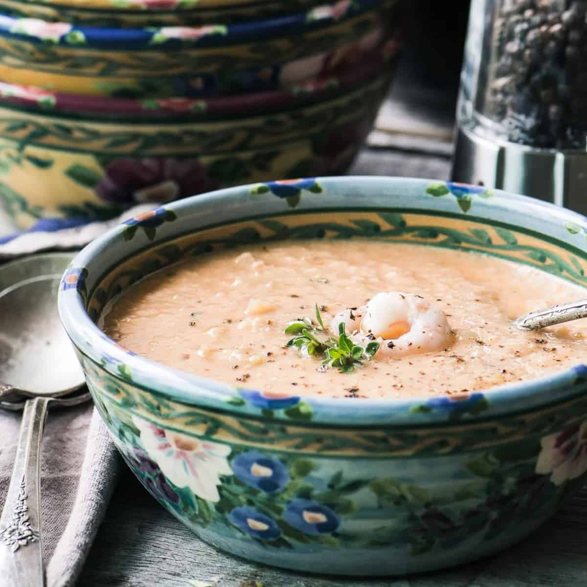 Shrimp Bisque is a creamy French shellfish soup. It's similar to a chowder, but fancier. This elegant soup has a creamy texture, intense flavor, and beautiful pale pink color. Get the recipe: Creamy Shrimp Bisque