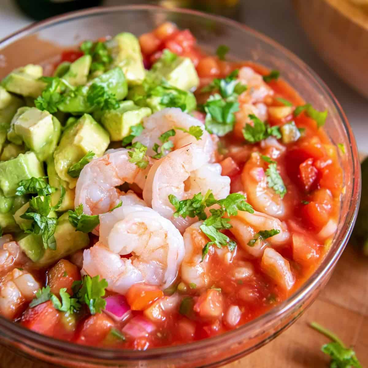 Mexican Shrimp Cocktail (or coctel de camarones), is a fun and festive party snack. Succulent shrimp in a spicy pico de gallo mixture are layered with avocado, cilantro, and fresh lime juice. Serve with tortilla chips and watch it disappear. Get the recipe: Mexican Shrimp Cocktail