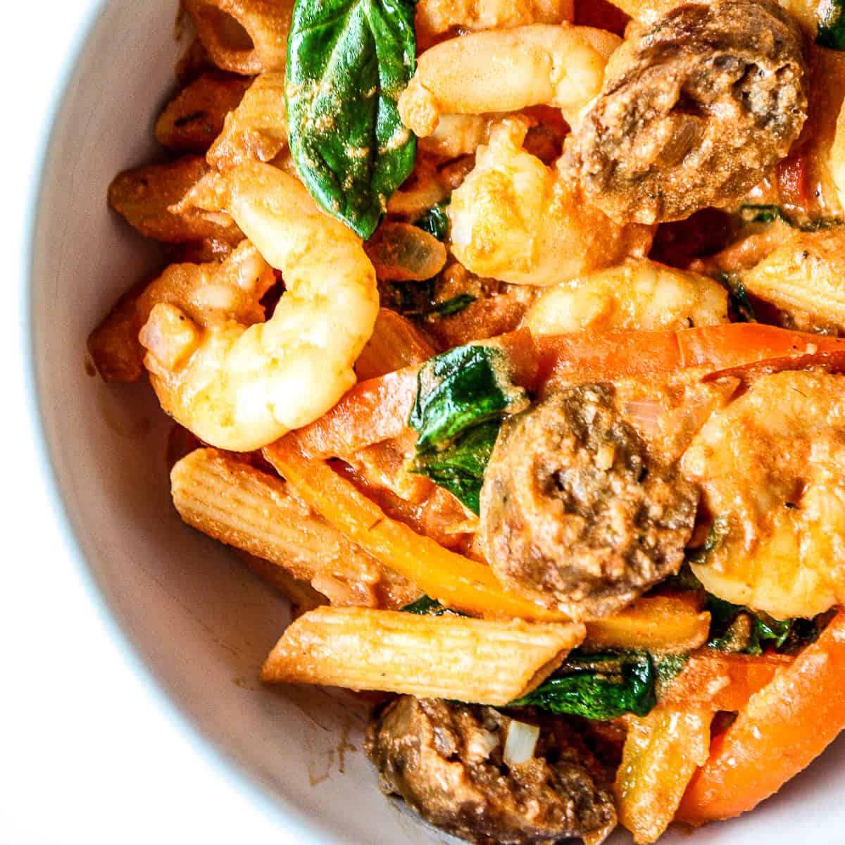 Cajun shrimp and sausage pasta is a hearty and healthy meal that's ready in less than 30 minutes. Bold Cajun flavors are paired with juicy shrimp, smoky Andouille sausage, and al dente penne, in a spicy, and creamy tomato sauce. Get the recipe: Creamy Cajun Shrimp and Sausage Pasta