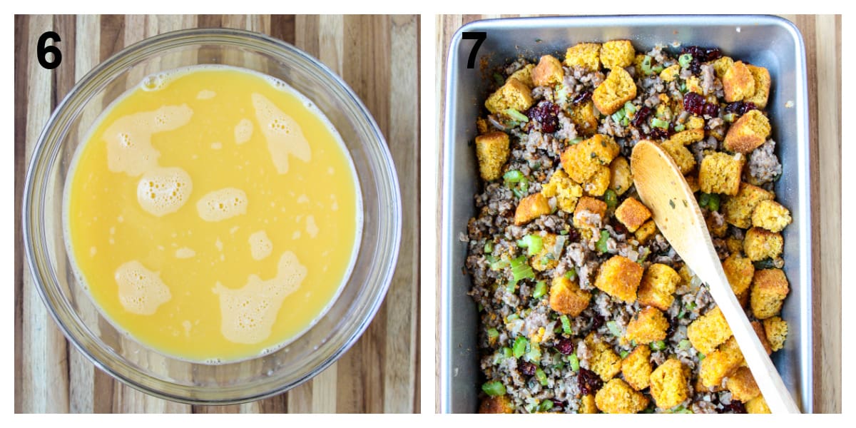 - In a bowl, beat the eggs and whisk in the chicken stock. Add the cooked sausage mixture, cornbread cubes, cranberries, salt, and pepper to the prepared baking dish, and stir to combine the stuffing.
