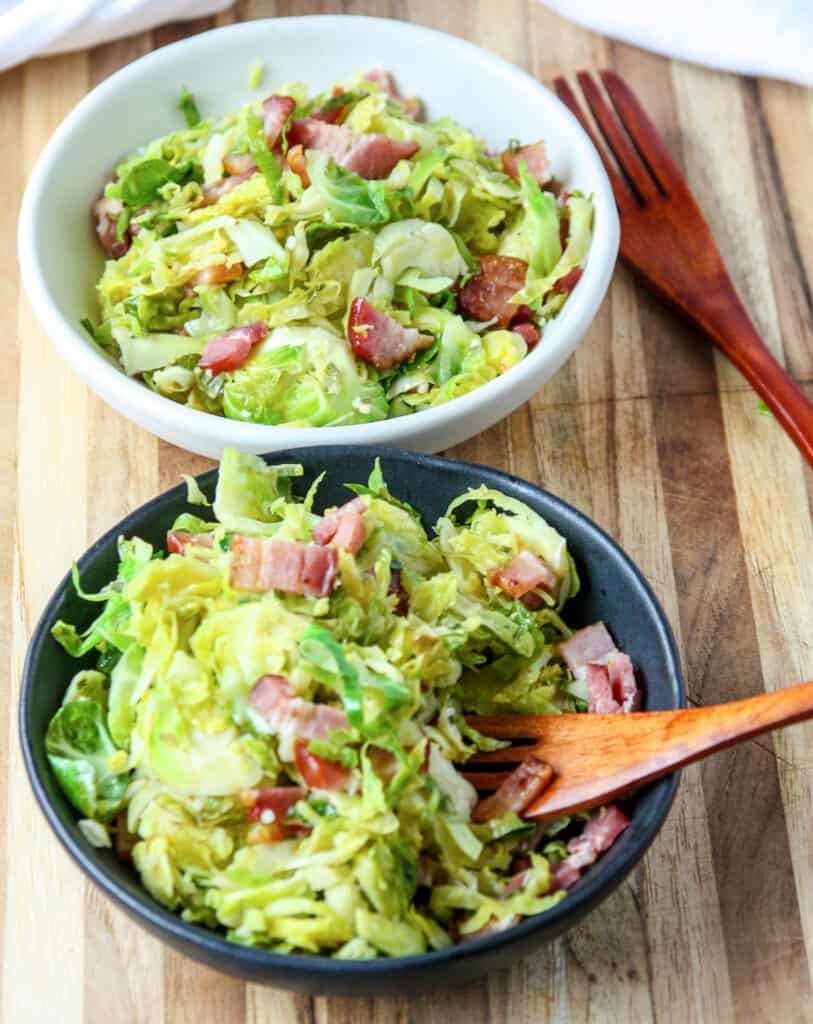 Shredded Brussels Sprouts with Bacon and maple syrup are the best brussels sprout recipe if you want a delicious side dish in a hurry. These pan fried sprouts take just 20 minutes!